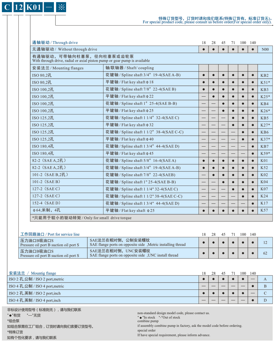 CJA10VSO系列柱塞泵,采用斜盘式结构用于开式回路的变量柱塞泵,具有响应快、噪音低、功率密度高、长寿命等优点,具有压力补偿、远程压力、负载敏感、恒扭矩,电子比例控制等多种控制方式,可以串联其他泵。额定压力28MPa,峰值压力35MPa,排量28~140ml/r。串接的齿轮泵作为先导泵或副泵使用,完全替代进口元件,广泛用于工程机械、塑料机械、重型装备、矿山设备、冶金、水利、船舶、机床等。